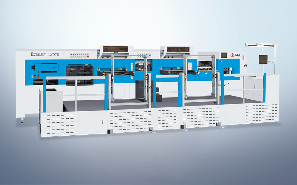 本機采用高精密間歇機構(gòu)、氣動鎖板、氣動離合、電動調(diào)壓、給紙離合、傳動機構(gòu)。設(shè)備運行高速穩(wěn)定。氣動取樣機構(gòu)、自動供油潤滑、油溫冷卻功能。使本機在使用過程中充分發(fā)揮工作效率。電器控制系統(tǒng)、PLC和電動凸輪對本機進行監(jiān)控顯示,故障點檢測顯示,實現(xiàn)人機交流。雙機組能適應(yīng)多工藝一次成型,使產(chǎn)品工藝更便捷更高效??蓪崿F(xiàn)雙燙金、燙金+模切清廢、燙金+壓紋、壓紋+模切清廢,多功能匹配操作。